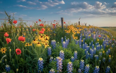 Vibrant Wildflowers Bloom Under a Cloudy Sky with a Rustic Fence Line meadow texas bluebonnets