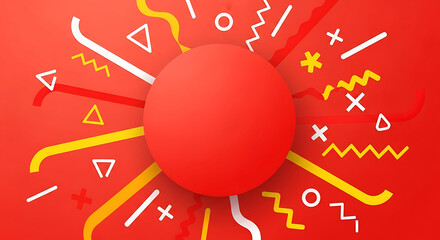 Abstract red background with a central red sphere and scattered geometric shapes and lines image
