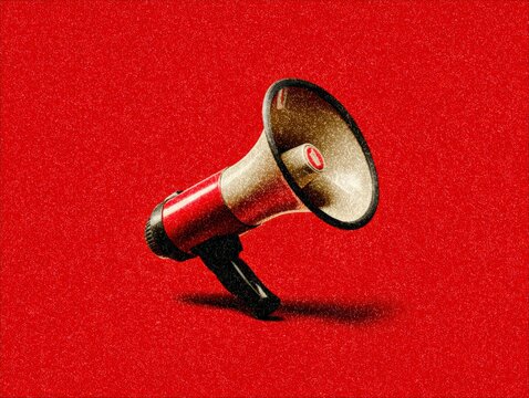 A minimalist collage featuring a megaphone against a vibrant red background, showcasing geometric patterns radiating from the device, emphasizing communication and expression. neutral background