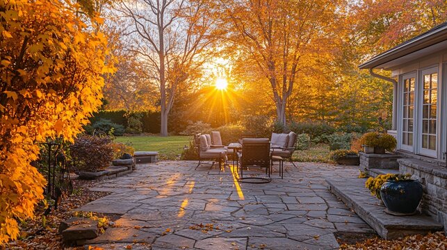Autumnal sunset illuminates patio furniture on stone patio.