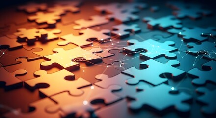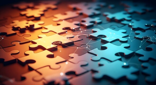Abstract arrangement of interlocking puzzle pieces with warm and cool lighting creating a dynamic visual effect