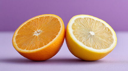 Vibrant citrus balance with sliced lemon and orange on purple background