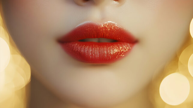 Vibrant red lips of an Asian woman, smooth skin with slight shimmer, lips slightly parted, soft focus on lips and blurred golden background