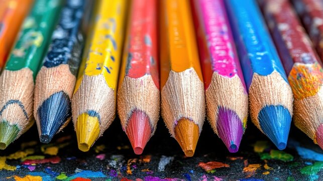 Close-up view of sharpened colored pencils in vibrant hues.