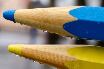 Colored pencils lying diagonally in a row, selective focus.