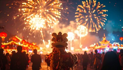 A cultural festival at night, with crowds and bright fireworks in the sky, and a lion dance performance