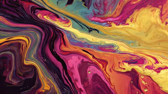 Swirling, vibrant abstract art featuring flowing, blended paints in hues of gold, pink, blue, yellow, and orange