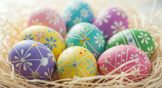 Colorful Easter Eggs with Various Patterns on Wooden Background.