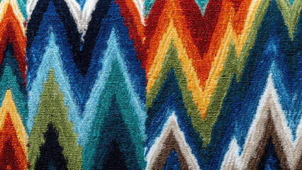 A vibrant, multi-colored zigzag pattern on a textured fabric, showcasing a lively and intricate textile design with various hues.