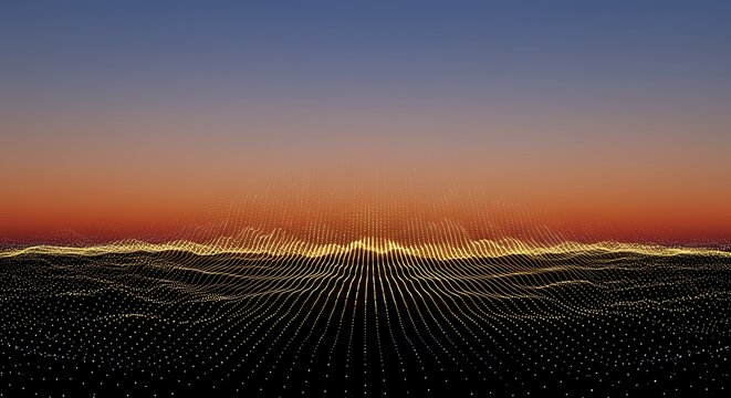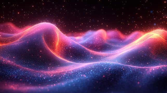 A vibrant digital landscape with glowing dots and flowing purple waves, representing data streams or abstract technology concepts.
