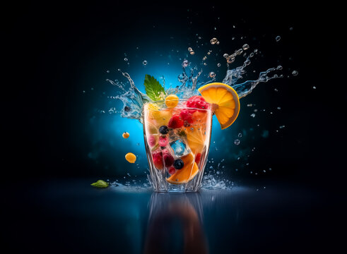 Vibrant citrus fruit slices submerge into clear liquid creating many splashes and bubbles.
