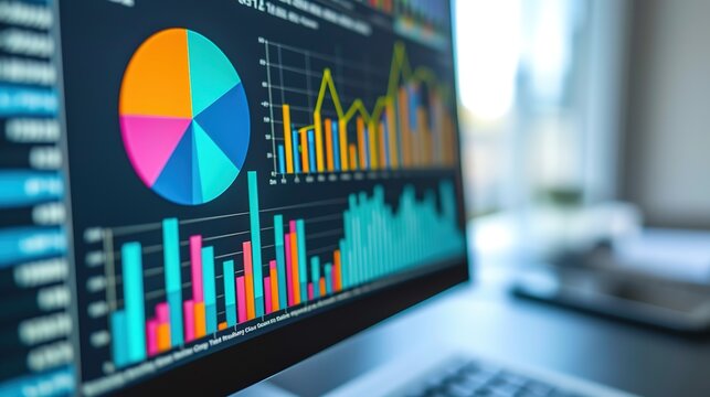 vibrant display of bar graphs, pie charts, and line trends showcasing data analysis and growth. colorful visuals represent business insights and statistics