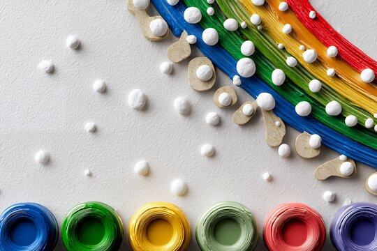 Colorful rolled paper art with rainbow and white textured elements on white surface