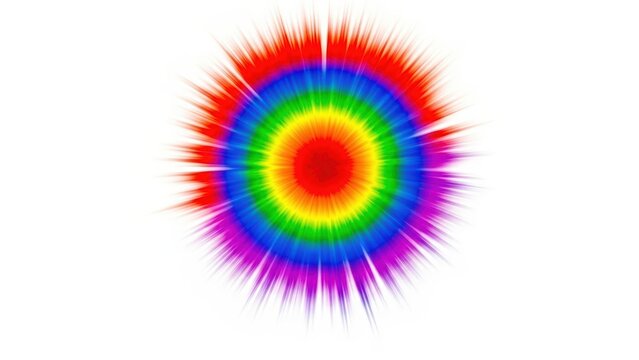 A vibrant, radial burst of rainbow colors with a red center and radiating spikes on a white background.