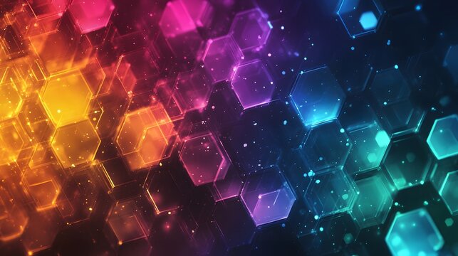 A geometric pattern of vibrant hexagons in hues of blue, pink, and orange, arranged in a symmetrical grid against a backdrop of dark grey, creating a captivating visual composition