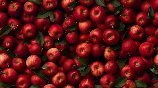 Ripe red apples with green leaves create a vibrant and textured background, perfect for food and health-related themes