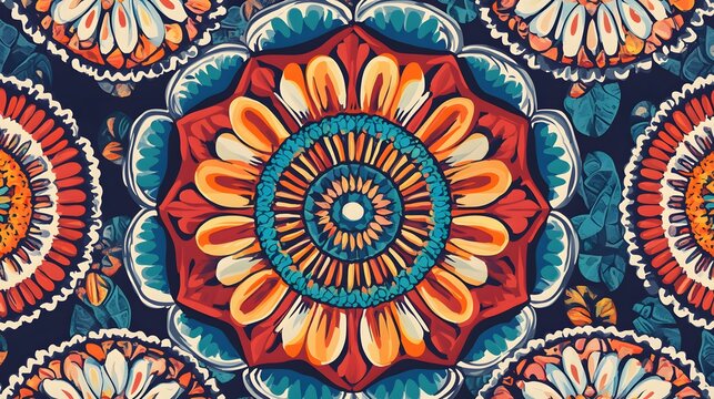 A vibrant pattern of concentric circles in bold colors and intricate line work, creating a visually captivating design.