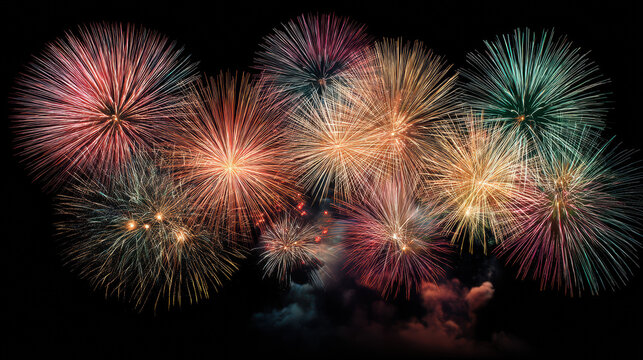 Vibrant multi-colored fireworks exploding in night sky