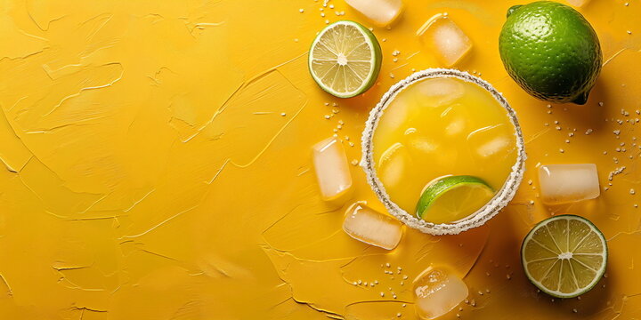 A refreshing iced citrus cocktail in a salt-rimmed glass garnished with lime wedges surrounded by ice cubes and whole limes on a vibrant yellow textured background