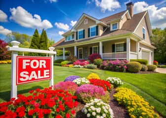 A bright red for sale sign stands out in front of a stunning classic suburban house with a lush green lawn and vibrant flowers in bloom.