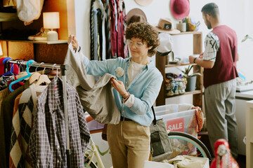 Man with curly hair examining clothing item in vibrant vintage store while another person browses items in background. Environments filled with diverse articles and sale signs
