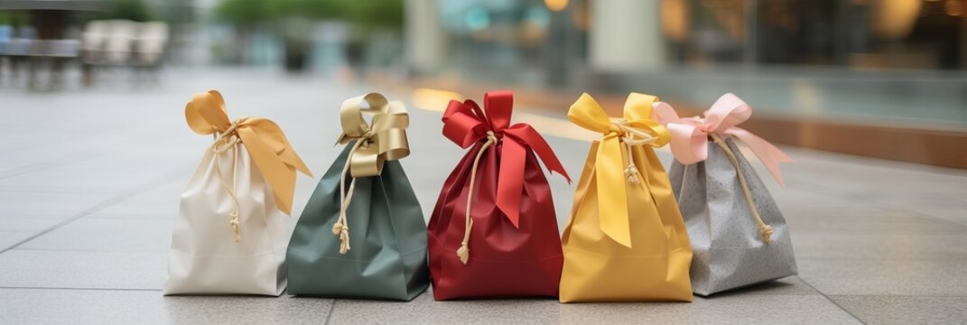 Row of vibrant multi-colored gift bags standing in a line, black friday sale concept banner