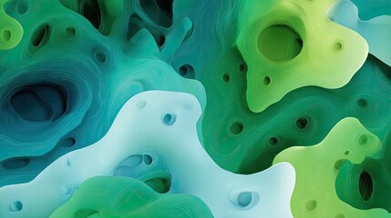 Abstract swirling shapes of vibrant teal, mint, and light blue tones, reminiscent of organic forms, like cells or caverns