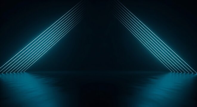 Immersive abstract scene features luminous neon triangles and lines illuminating a dark, industrial interior space, creating a modern atmosphere with a cyberpunk or futuristic vibe.