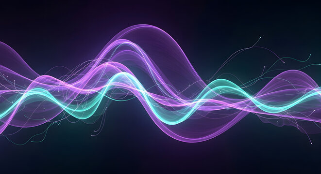 Abstract digital visualization of flowing energy with vibrant glowing purple and turquoise light waves on a dark background