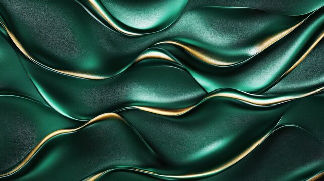 A stunning abstract background featuring smooth, wavy lines in rich emerald green tones with golden accents, perfect for design work and presentations.