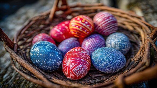 Exquisite assortment of vibrantly decorated eggs with intricate patterns and details nestles within a rustic, woven wicker basket, capturing the essence of traditional celebration against a blurred