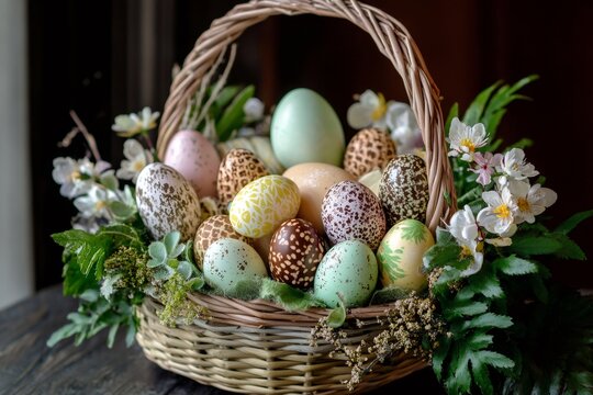 Cozy Easter Basket Arrangement on Rustic Wooden Table A close up, still life composition of a rustic, woven Easter basket brimming with vibrantly colored, speckled eggs and delicate spring blossoms.