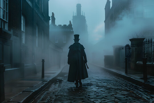 a street with a light on and a building in the background, A Victorian-era London street with cobblestones and gas lamps