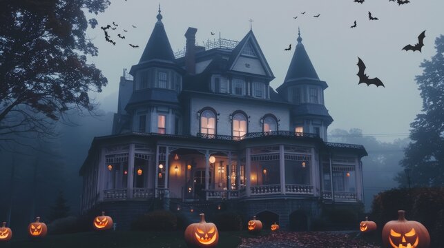A grand, haunted Victorian house stands tall amidst a foggy dusk sky, surrounded by glowing jack-o'-lanterns and swirling bats.