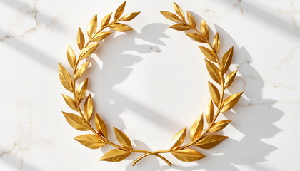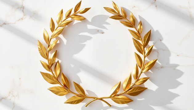 Golden laurel wreath shining in sunlight on marble wall, symbol of achievement