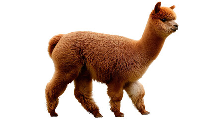 A furry brown llama portrait, a South American camelid mammal with a white head against nature