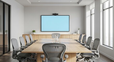 Diverse company employees having online business conference video call on tv screen monitor in board meeting room. Videoconference presentation, global virtual group corporate training concept.