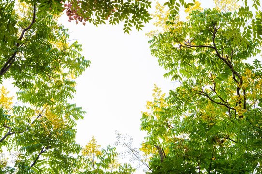 Picturesque autumn landscape with view of birch trees tops with yellow foliage against sky in cloudy autumn day. Beautiful natural background, wonderful nature, seasons changing concept