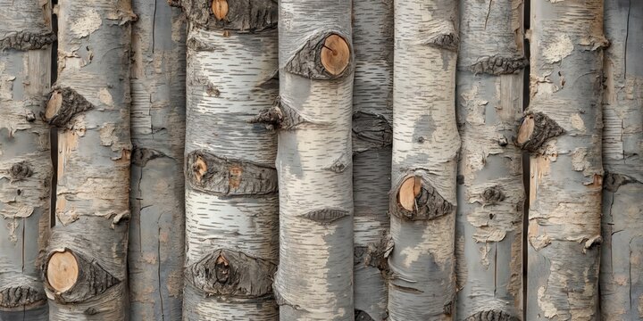 Close-up of birch tree trunks with textured bark and knots, showcasing a natural, rugged pattern. Ideal for abstract wood backgrounds, highlighting organic, weathered surfaces.