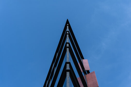 Photograph of a modern glass building with a sharp triangular roof, viewed from below against a clear blue sky. The image emphasizes architectural geometry and urban design.