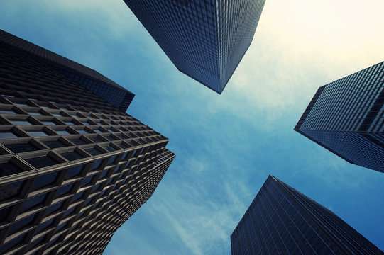Abstract urban view from below looking up at skyscrapers forming a cross in blue sky at a big city intersection