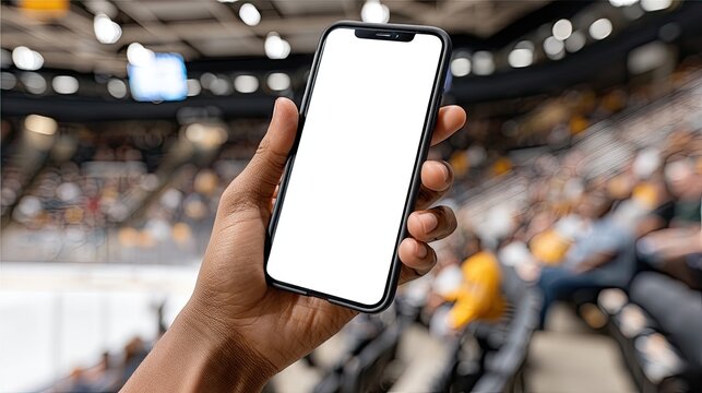 Hand holds a blank mobile phone in front of a hockey stadium during a lively game, showcasing a large crowd and bright lights