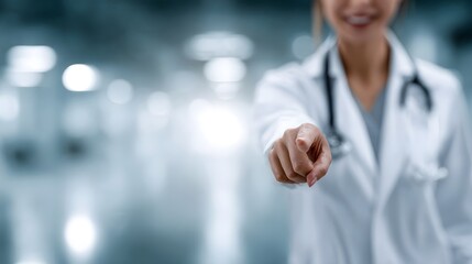 A doctor points directly at the viewer indicating choice or a call to action in a healthcare setting