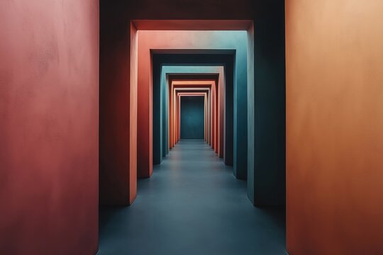 A series of connected corridors showcases bold colors and geometric shapes, leading the viewer into a mesmerizing depth and dimension