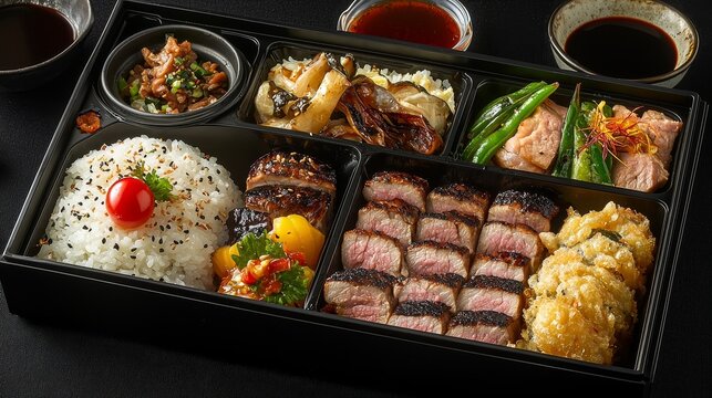 Japanese Bento Box TopDown View of Grilled Meat Rice and Vegetables A delicious assortment of Japanese flavors in a black bento box The vibrant red cherry tomato stands out