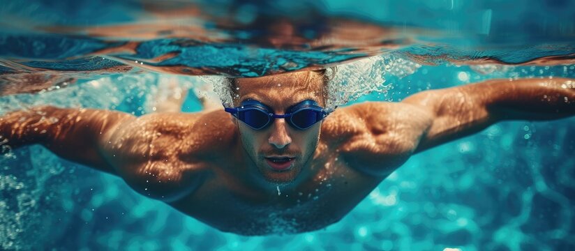 Swimmer in action: Immersed in a burst of water swimmer with goggles and cap pushing limits in a vigorous swim The spirit of competition
