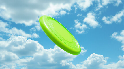 soaring Disc in the Sky: A vibrant green disc soars gracefully against a backdrop of a clear blue sky dotted with fluffy clouds, symbolizing freedom, play, and summertime fun.