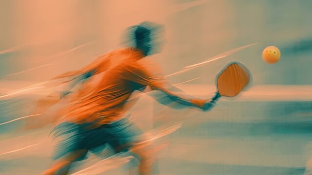 Motion blur captures an athletic pickleball player in action on the court, showcasing dynamic gameplay and vigorous movement during a spirited match.