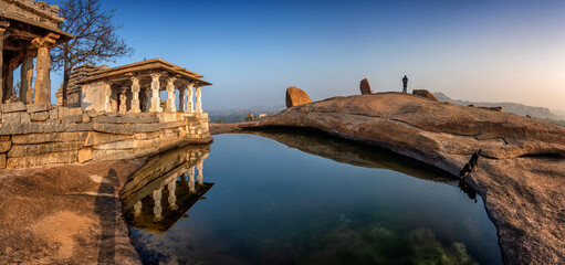 View of sunrise at Pushkarni, Sri Krishna tank in ruins. Hampi, karnataka, India.
