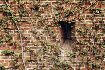 Green ivy leaves spreading over an aged brick wall with visible weathering and texture variations